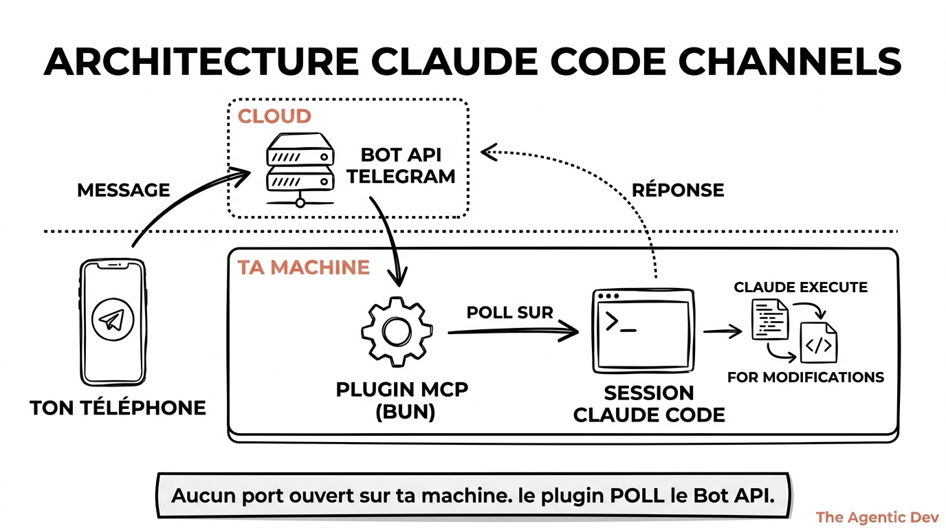 - On your machine, the MCP plugin (running on Bun) polls the Bot API
