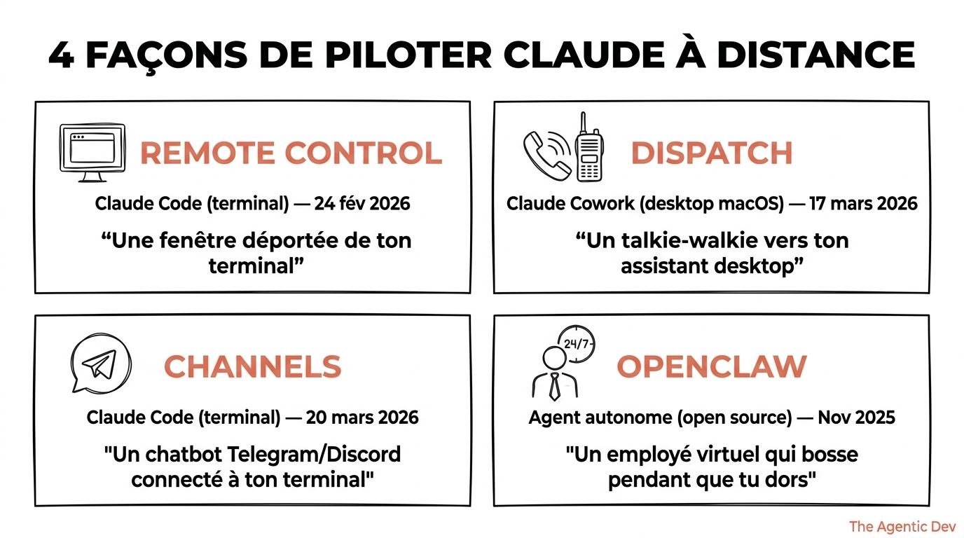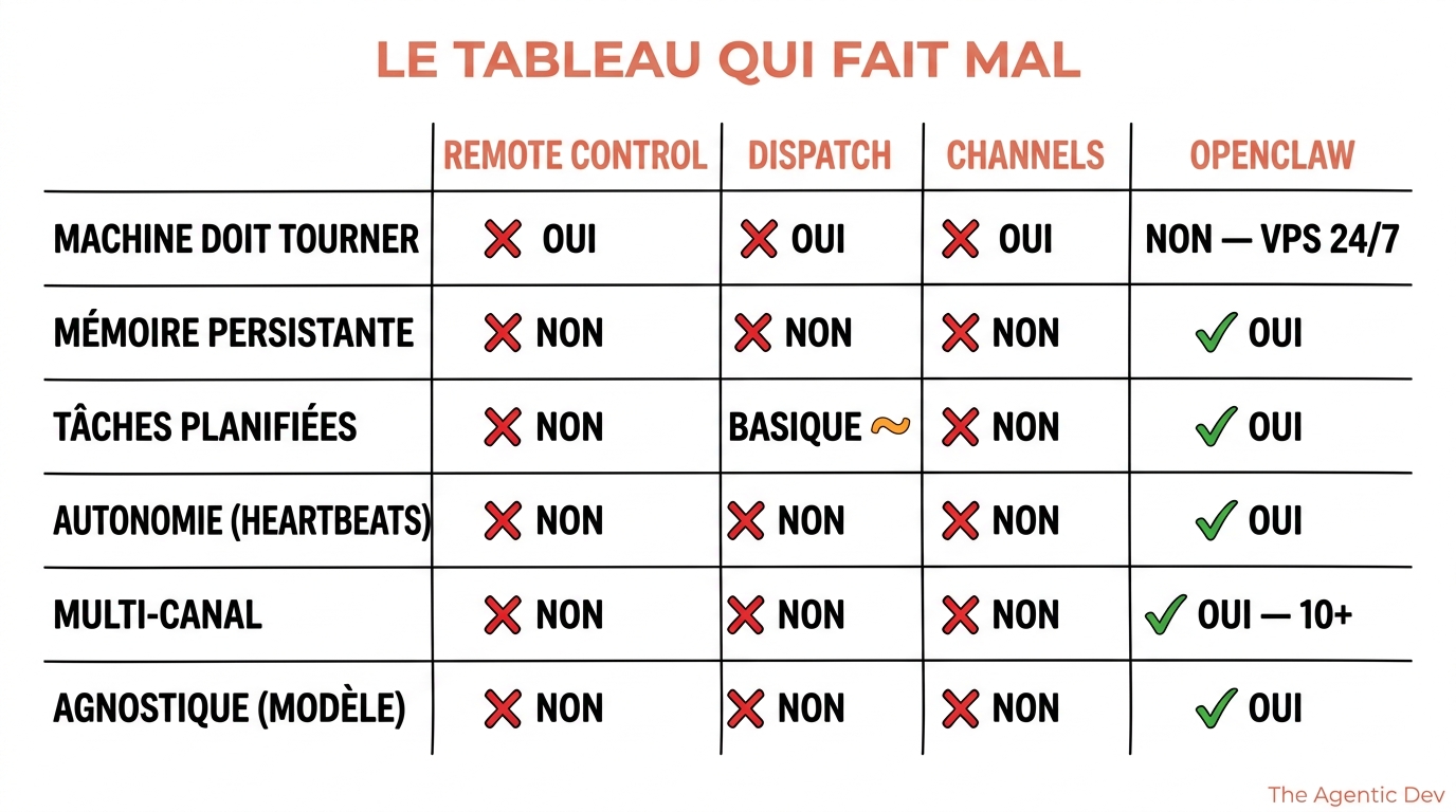 | Remote Control | Dispatch | Channels | OpenClaw | |